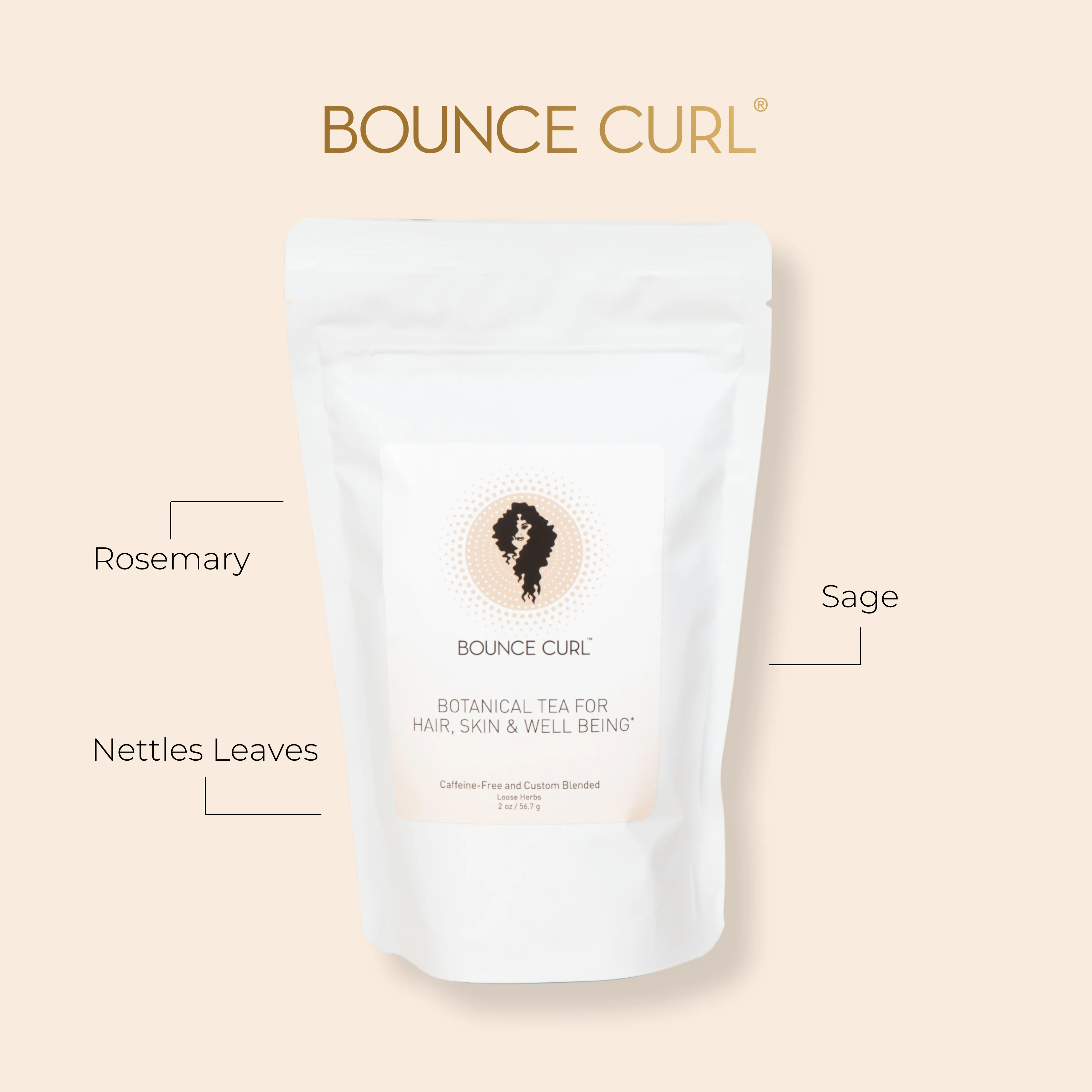 Bounce Curl Botanical Tea for Hair, Skin & Well Being is a caffeine-free herbal tea inspired by a traditional family recipe, designed to support healthy hair, skin, and overall wellness.